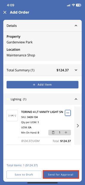 When reviewing the order, we can change the item quantity, add additional items, and more. When satisfied that the order is complete, tap 'Send for Approval.'