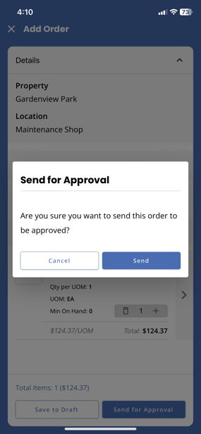 To confirm, tap 'Send' to route the order to the next person in the property's approval workflow. And with that, the order has been created and is now pending approval.