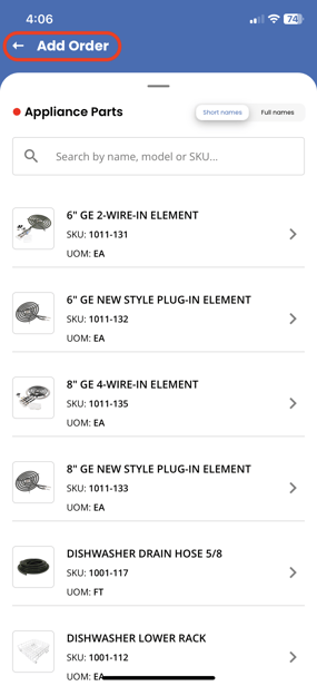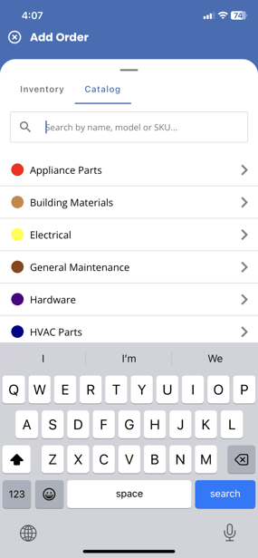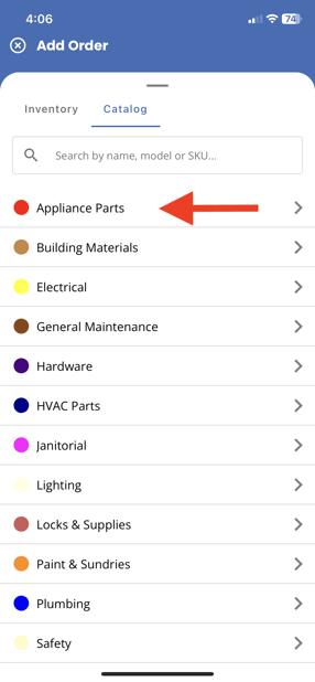 Each property team has a custom Property Catalog from which they order parts and supplies for their property. To place an on-demand order from your property's catalog, tap 'Order Products.'