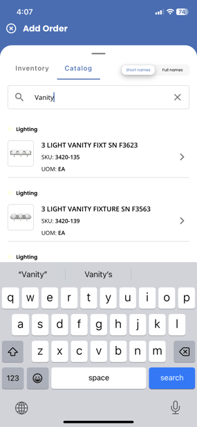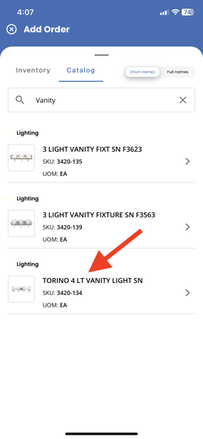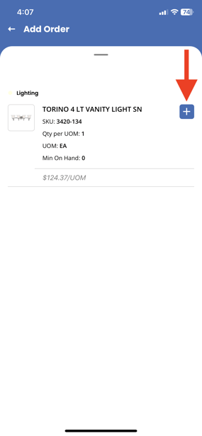 Once we have added the desired fixture, we can tap 'Add Order' in the top-left corner to continue building this order. If the fixture is the only item we would like to order, tapping 'Review Order' will immediately move us to the Order Summary screen.